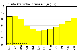 | Maandelijks gemiddeld aantal uur van zonneschijn per dag. |