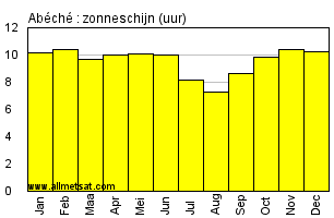 | Maandelijks gemiddeld aantal uur van zonneschijn per dag. |